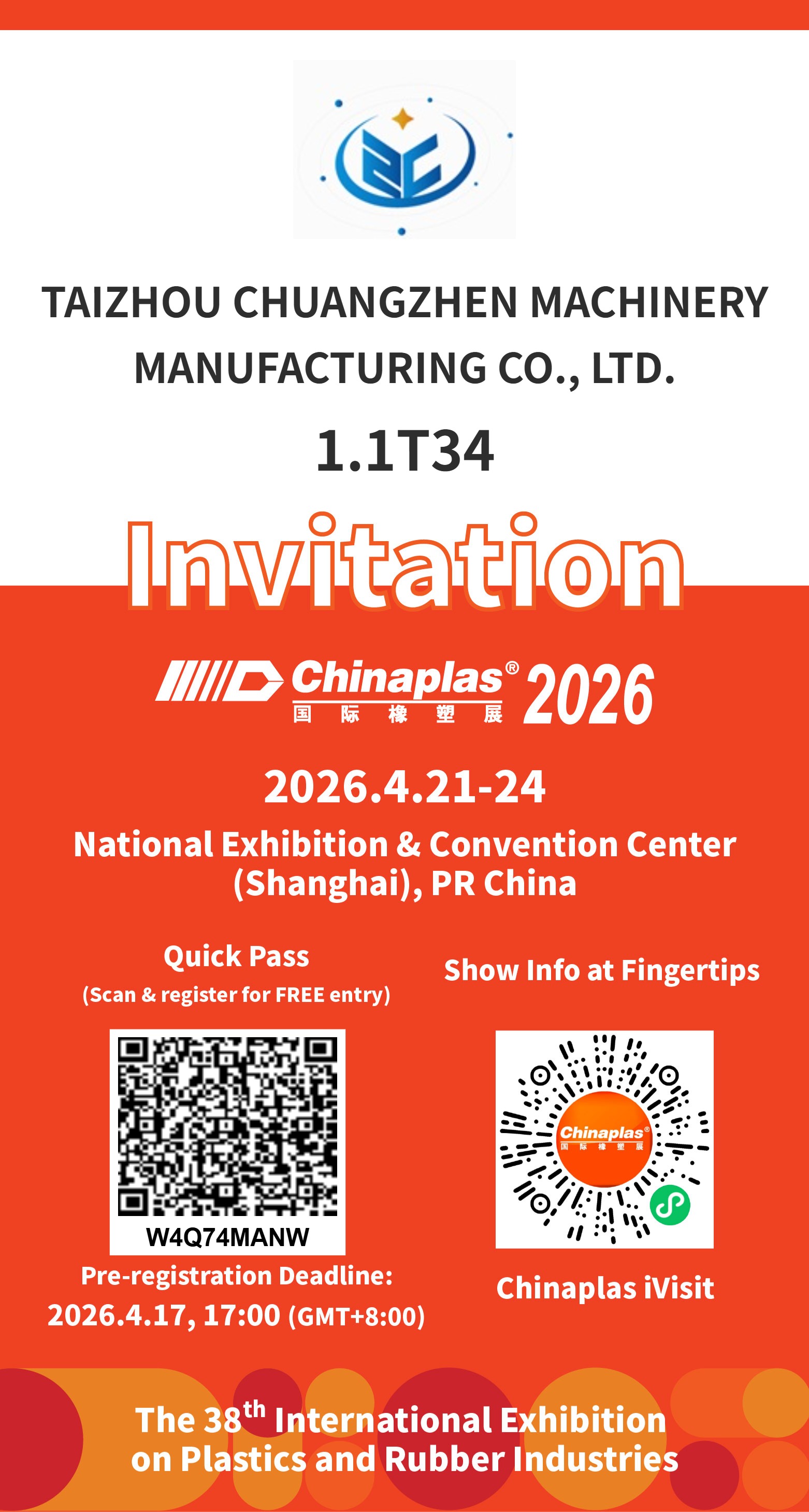 台州创真机械制造有限公司 总部位于中国浙江省台州市黄岩区的瓶盖模压成型设备制造商很荣幸地宣布参加第 38 届国际塑料橡胶工业展览会2026。